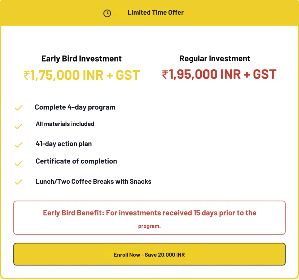 Yes! We offer corporate advantages including: Enroll 3 participants & get 1 complimentary, Enroll 5 participants & get 2 complimentary. Early bird benefits are also available for investments received 15 days prior to the program.